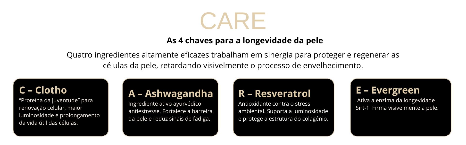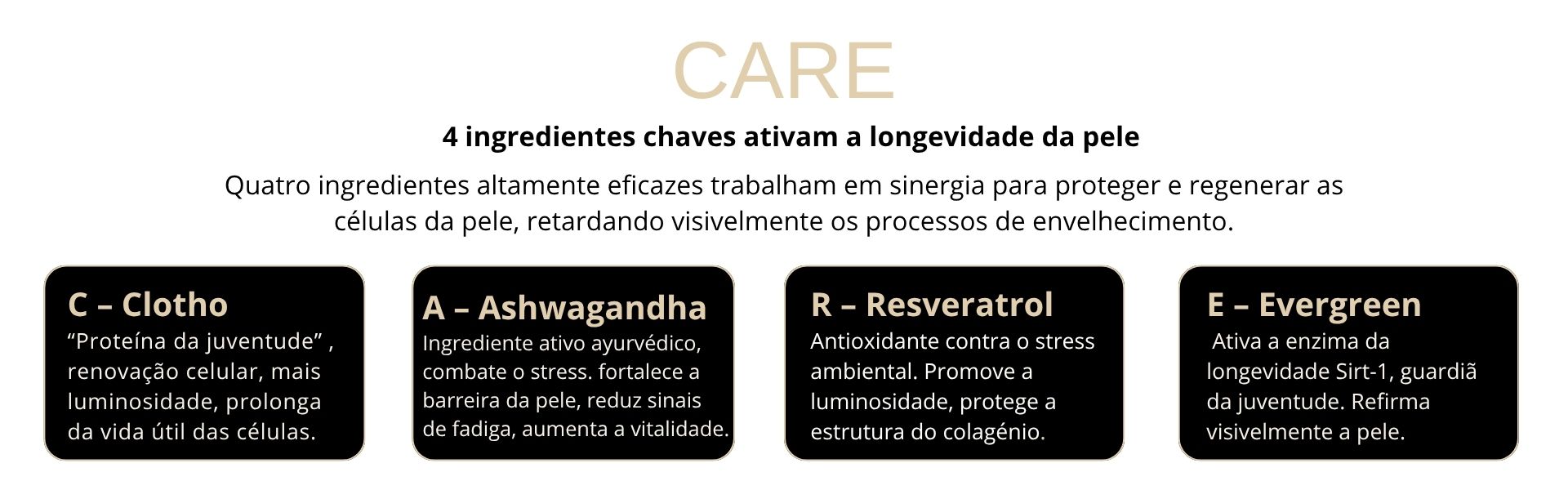 Longevity Care representa a simbiose entre Ciência, Biotecnologia de ponta e a Natureza - para resultados imediatamente visíveis e uma pele rejuvenescida a longo prazo.